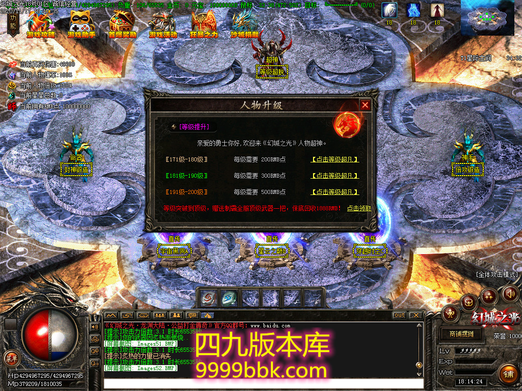 一步登天慢慢打元宝就是了,积分的用处就是买魔界金币生骑士团,骑士团一定要生,因为加真伤也就是切割。艾泽拉斯不推荐去,前期去了没用,所以这个充值首推精绝古城和红土大陆。