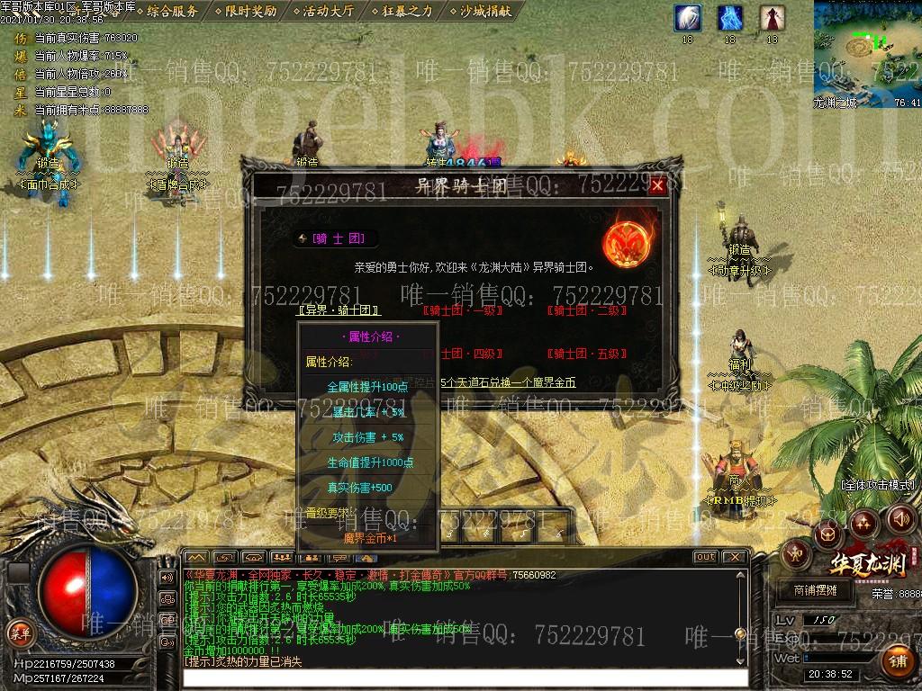 5.充值500元宝,骑士团打满,获取逆天30W真实伤害,全属性3000,血量:50000,以及30%元素属性!