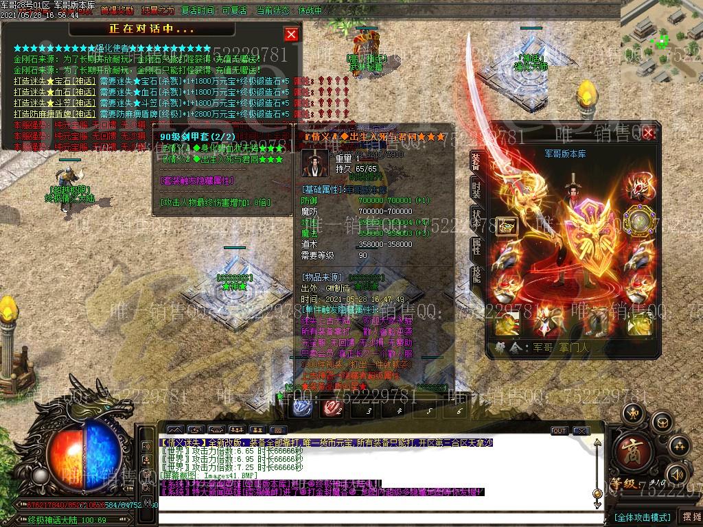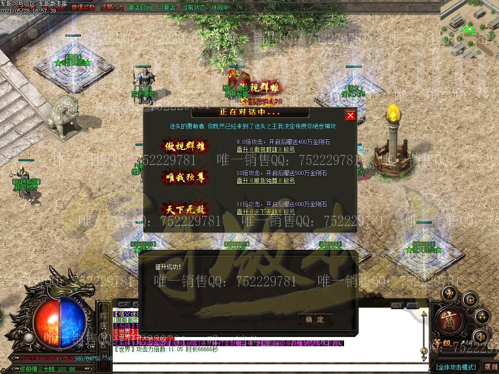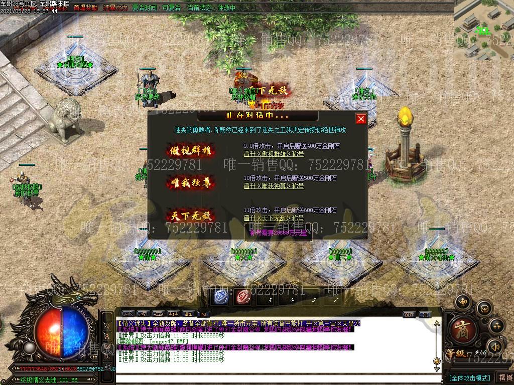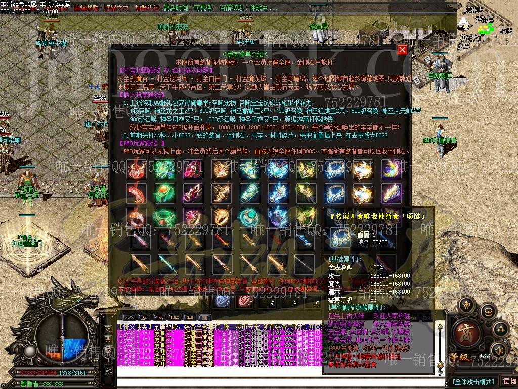 <【打宝地图路线 及 合区拿沙说明】 <><封魔谷 - 苍月岛 - 白日门 - 魔龙城 - 恶魔岛,每个地图都有超多隐藏地图.见房就进. <><本服开区后第二天下午四点合区,第三天拿沙!奖励大量金刚石元宝,玩家可以放心发展。 <【散人玩家路线】 <1,上线领取QQ群礼包获得施毒术+召唤宠物.召唤宝宝抗BOOS输出很给力. <1级召唤 神圣龙之王2只,600级召唤 神圣骷髅王2只,700级召唤 神圣红虎王2只,800级召唤 神圣大元帅2只