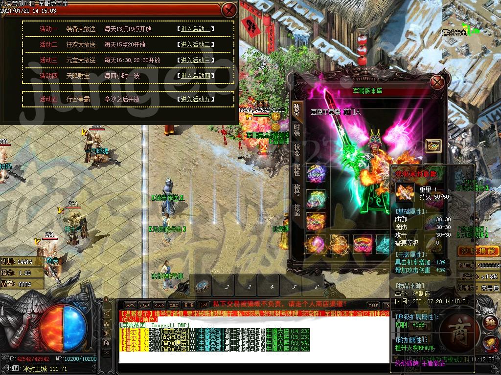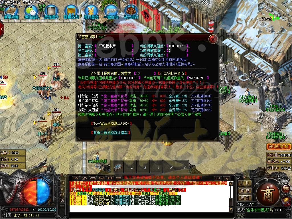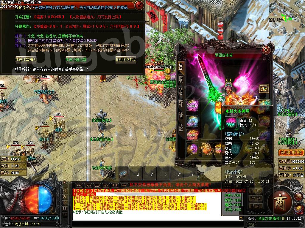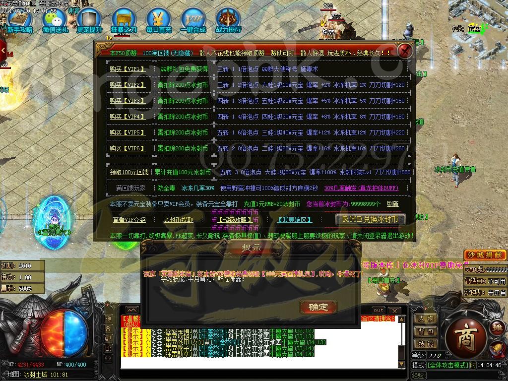【版本特色】∶充“100元冰封币”搞满回馈,30点,沙城捐献,10点,开狂暴独家复古单职业