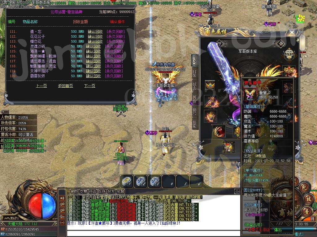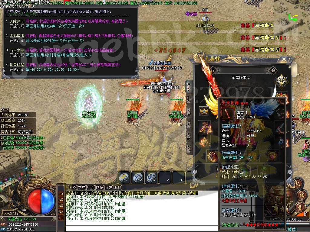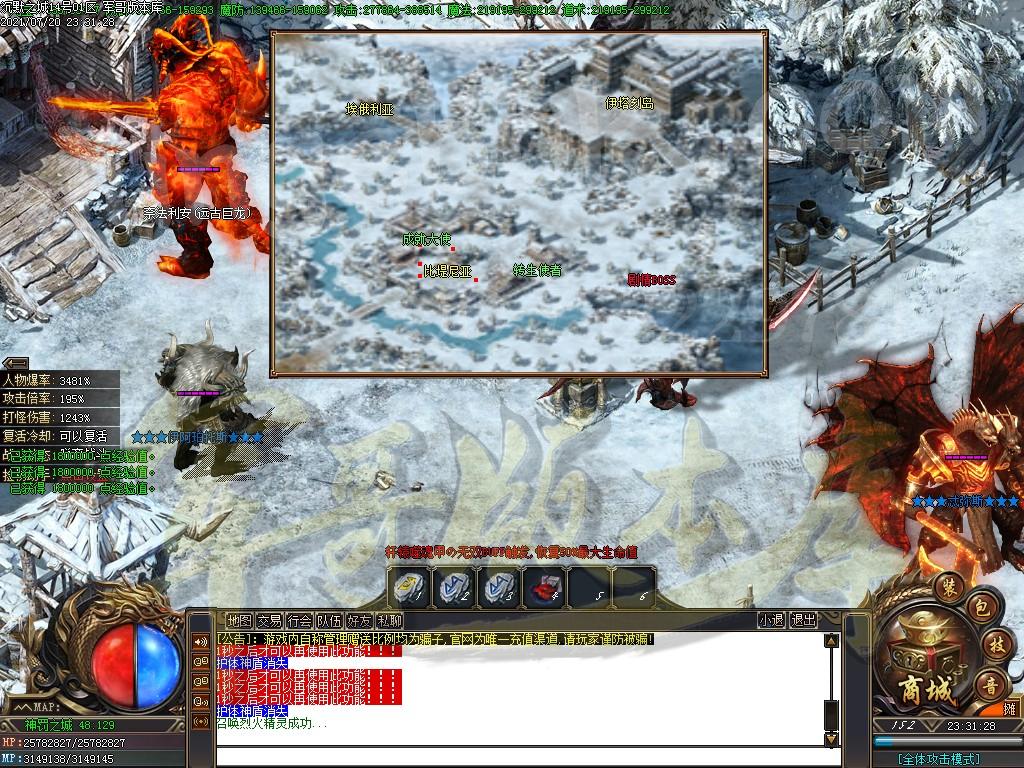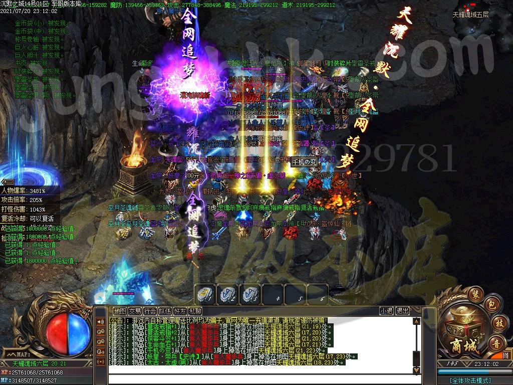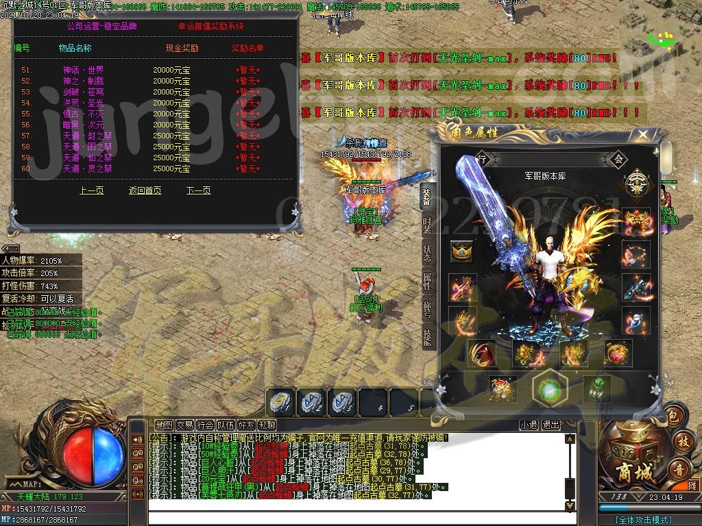 天耀魂域 第六季 更新内容: 巨龙怪添加金条爆率.爆不爆谁知道必爆金盒2个. 优化称号,装备合成材料消耗. 降低游戏难度,提高装备爆率(3倍). 群礼包改为免费,让白漂玩家发展容易一些. 修复已知BUG. 本服玩法新颖,长期稳定. 感谢各位兄弟对本服的支持.