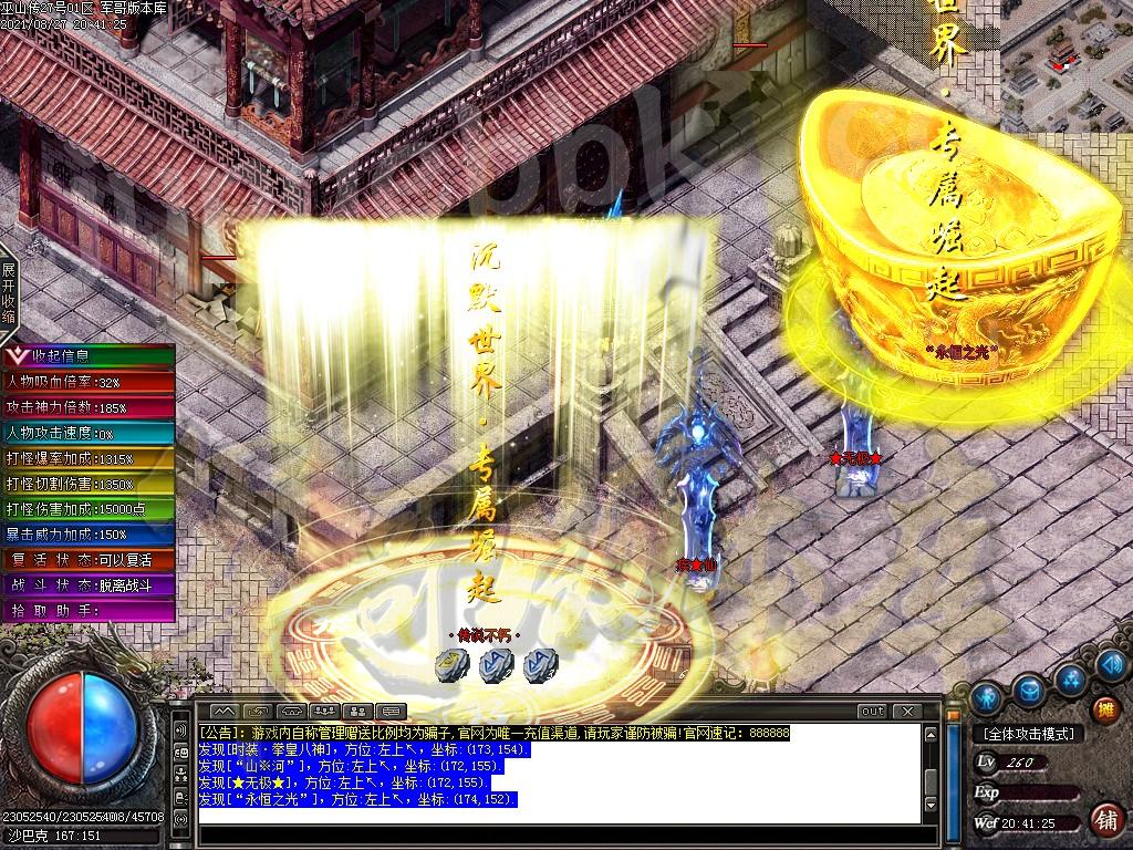 世界主城药店:  爆不爆谁知道                                  -- 30分钟刷新,随机必爆玛法专属装备、几率爆出蛮荒专属、20转材料、必爆金盒