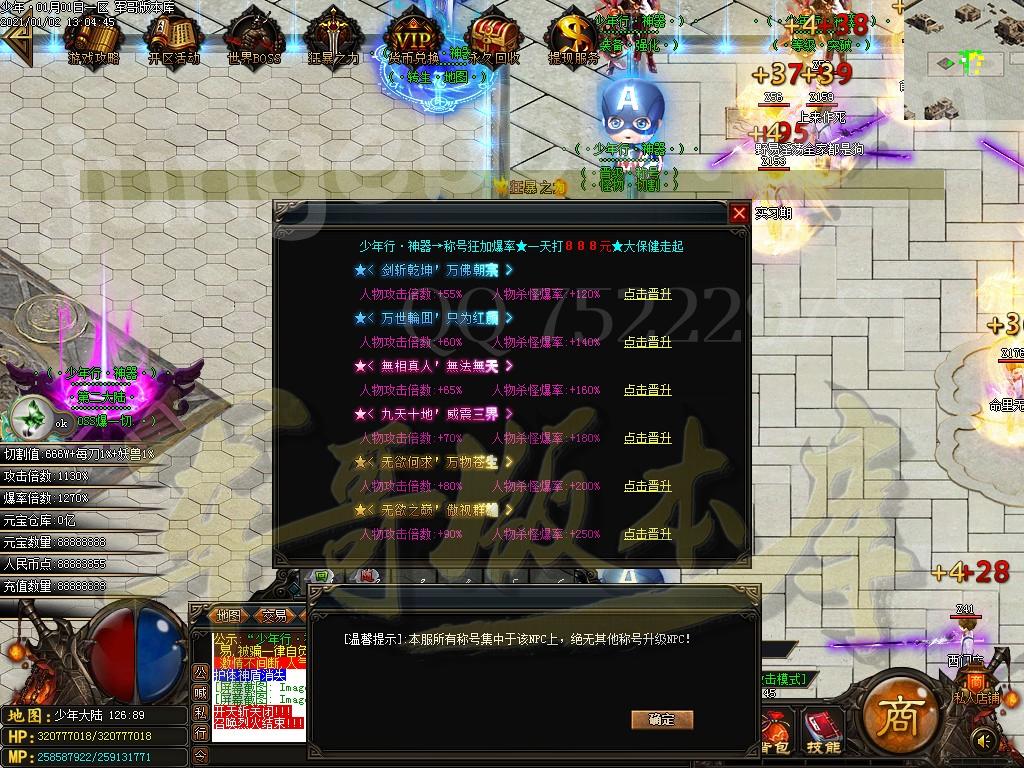 <称号介绍:共分20级,可以通过积分晋升,爆率狂加,所谓称号一升,光柱蹭蹭蹭蹭蹭蹭蹭!哈哈