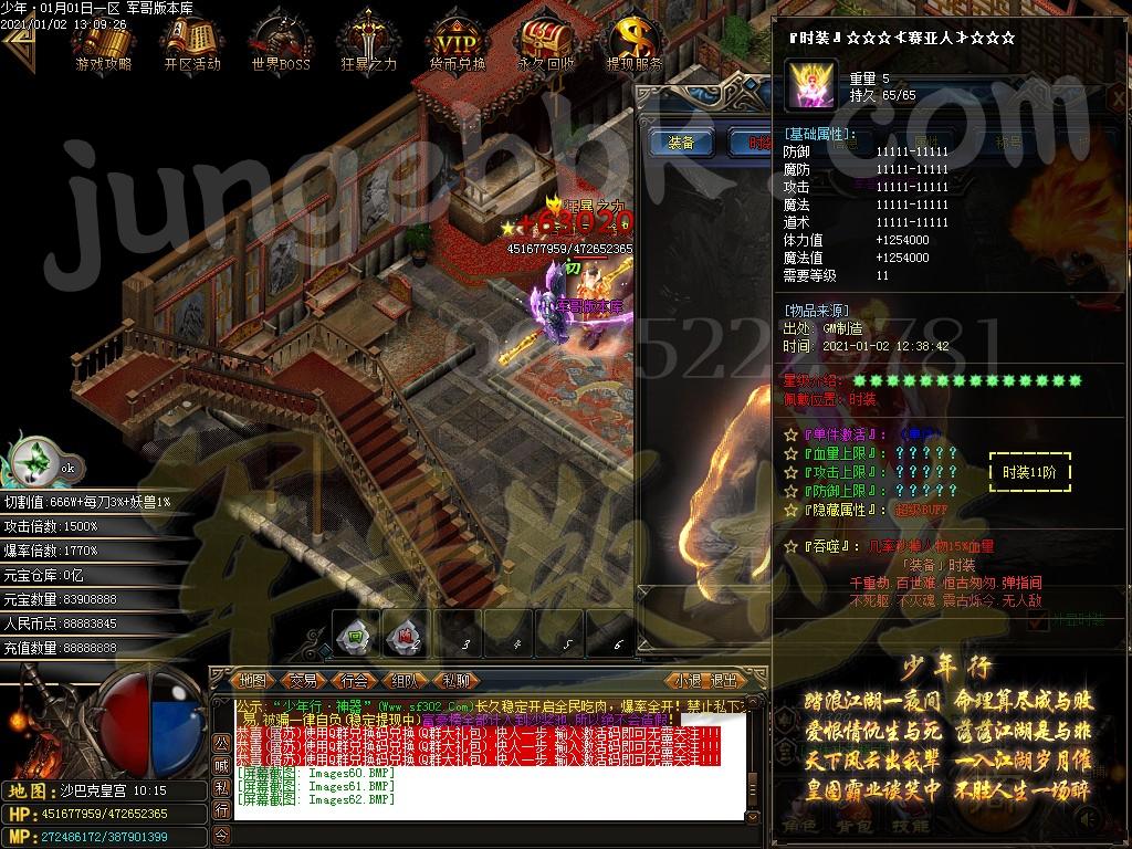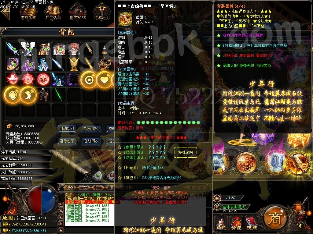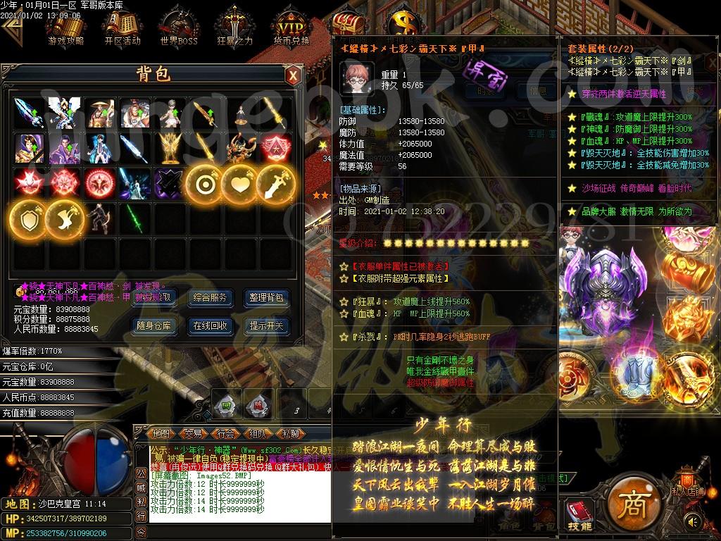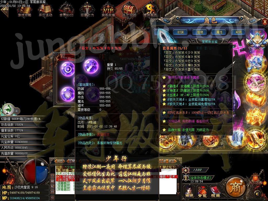 <装备介绍:本服共58套装备、5套倍攻首饰、时装15套、符文5套、特殊各18套、爆率全开新手怪都爆终极!