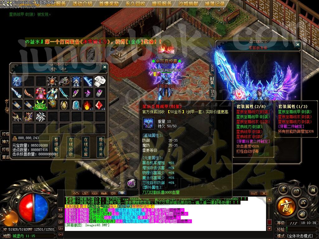 <50米时装:砍怪自动绿毒,两件套装增加攻速50%,全元素+6%,刀刀切割妖兽4000