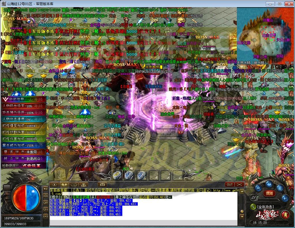 必抢地图世界BOSS[非常重要]: 前期新手: 恶魔祭坛[刷材料金币],困惑殿堂[小怪比较聚集,幽冥鬼爪爆率比较高] 玛法之城: 巨龙巢穴,暗黑领地,巫妖,圣光,古神领地 -- 90分钟刷新,此地图进入爆率加成300% 世界主城药店: 爆不爆谁知道 -- 30分钟刷新,随机必爆玛法专属装备、几率爆出蛮荒专属、20转材料、必爆金盒 真天宫藏金阁: ★★爆不爆谁知道★★ -- 30分钟刷新,随机必爆蛮荒专属装备、几率爆出中土专属、20-21转材料,必爆金盒 海底栖息地: ★★★★深海世界霸主★★★★ -- 30分钟刷新,随机必爆幽灵船特殊专属、几率爆出幽灵舰特殊专属[破该仔等] 阴阳结界: ◆◆◆阴阳界主◆◆◆ -- 30分钟刷新,随机必爆中土、北阴专属装备,21转材料,必爆金盒 ============================================================