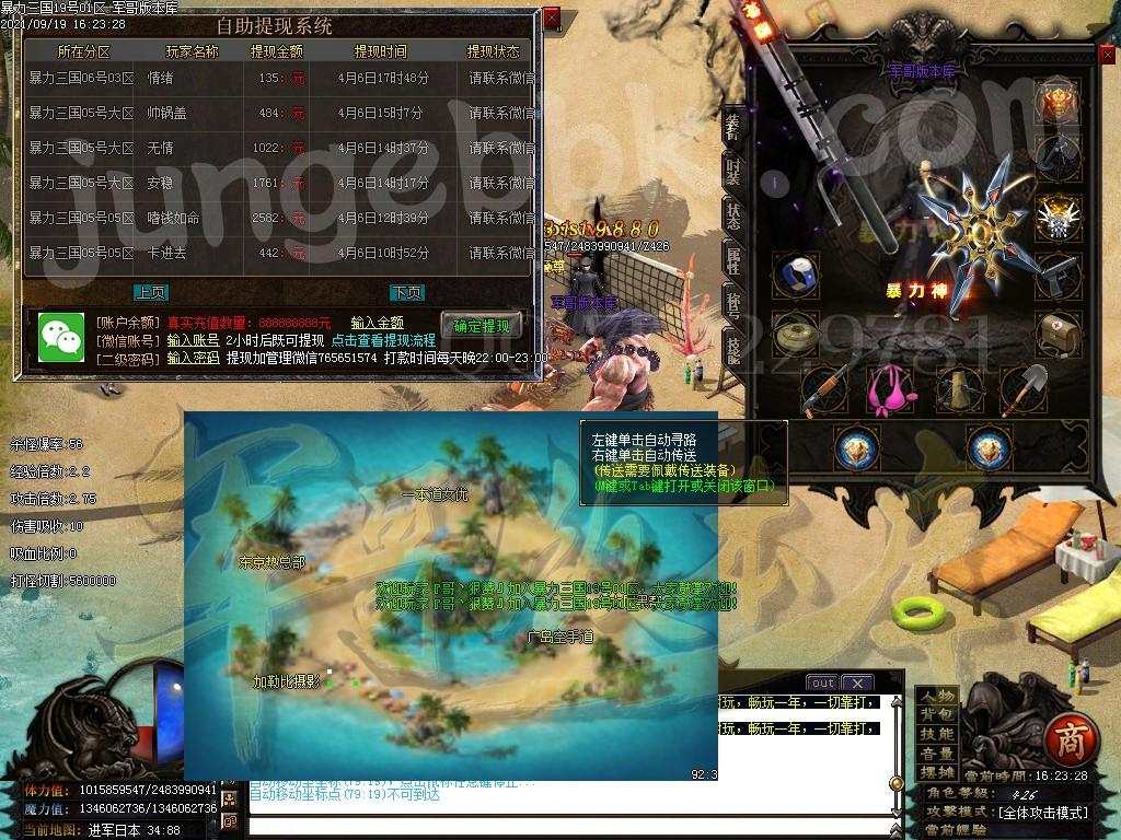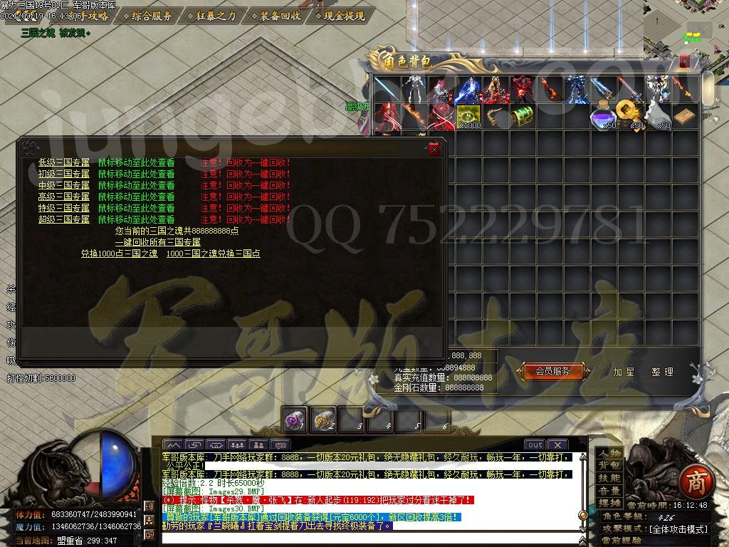 土豪玩家: 有实力的土豪玩家可多充充值点,可综合直接兑换材料,领取等级,直升满转生,宝宝,时装,军衔,满称号以及切割爆率倍功等N多属性装备!