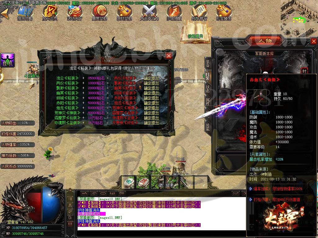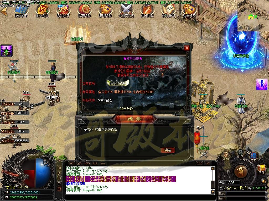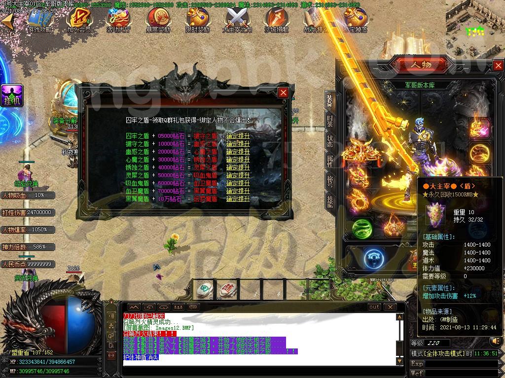 会员10万钻石 (50元)(获得爆率,倍功,打怪伤害   半月弯刀 魔法盾 隐身术  送10转+100万元宝)