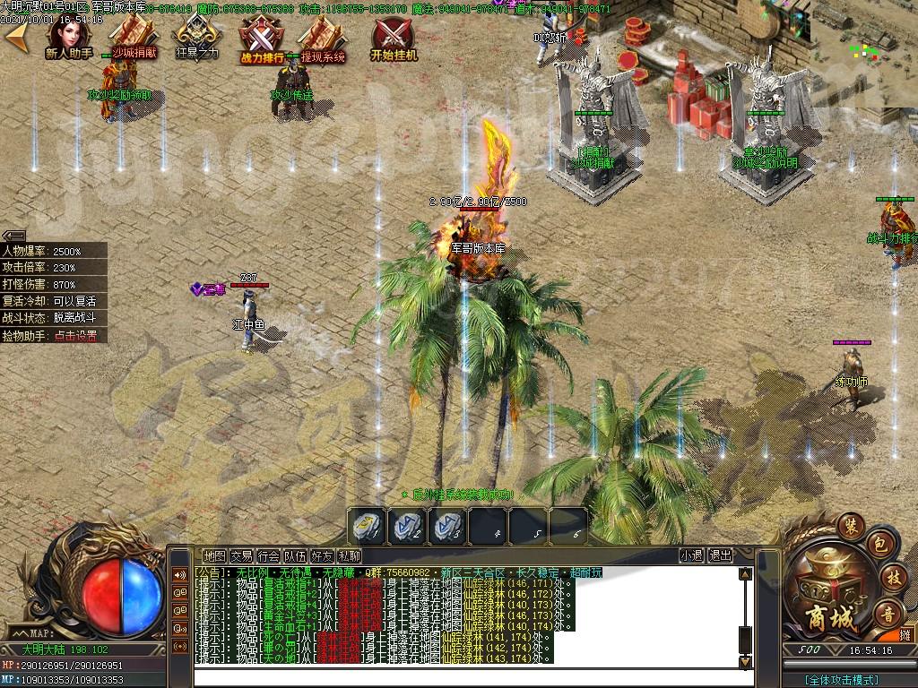2、背包按钮(功能服务)里有自动吃元宝、金币、经验卷,请自行开启!!!