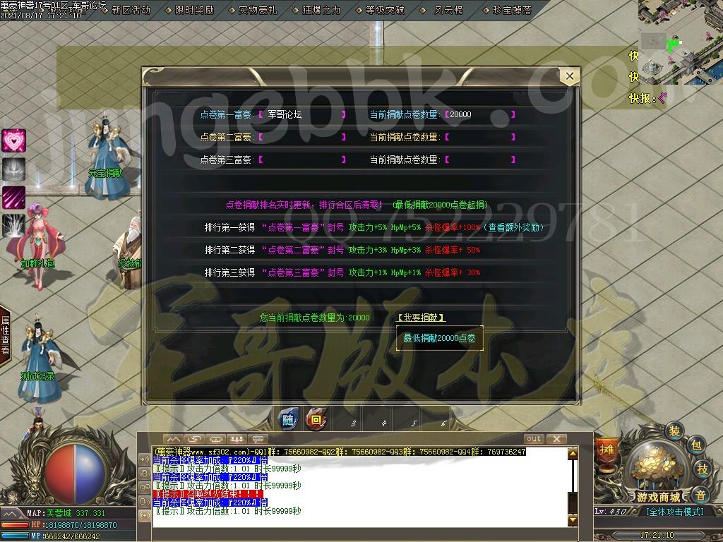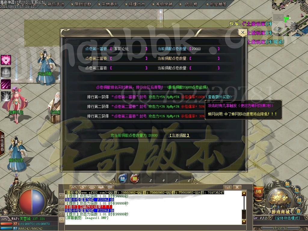 自动拾取 自动回收 F12挂机自动打怪  免费转区 怪爆充值 时间00.00-00.30  散人激情大服 娱乐为宗旨 低消费高回报 丰厚沙城红包