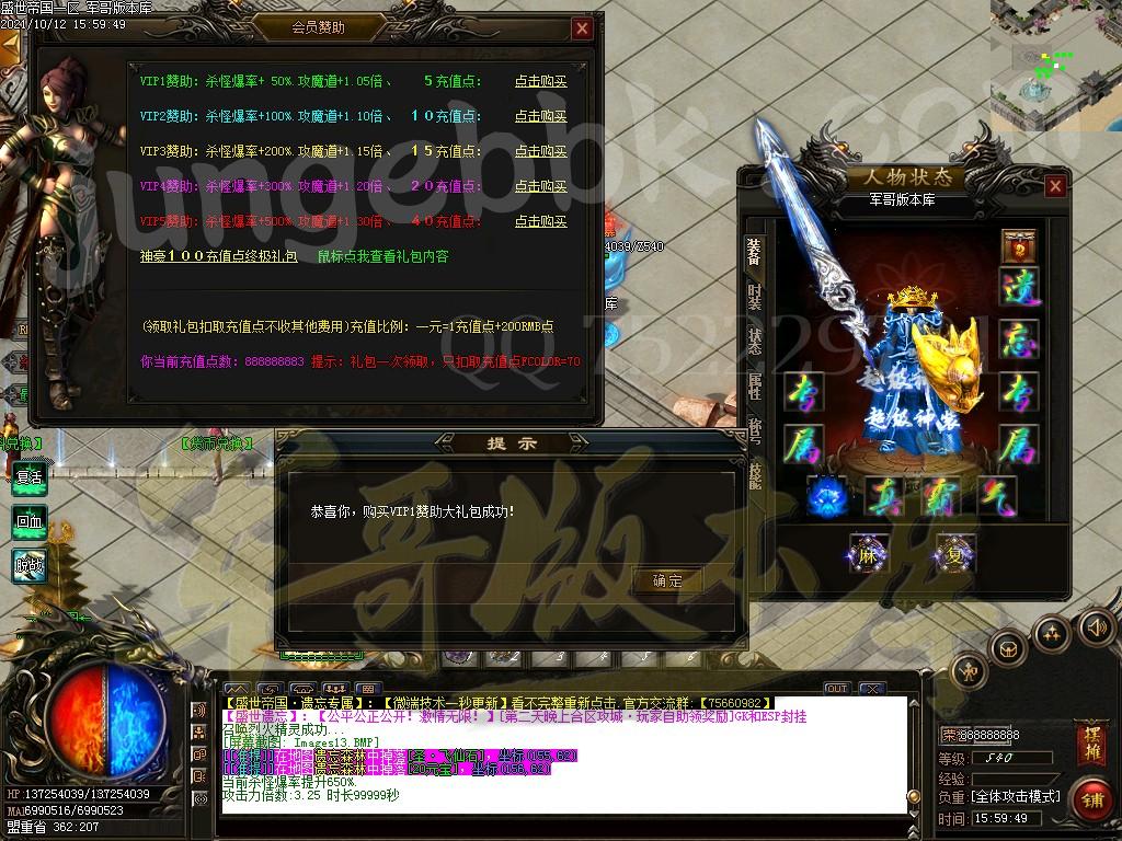 VIP3赞助:杀怪爆率+200%. 攻魔道+1.15倍、  15 充值点vip3