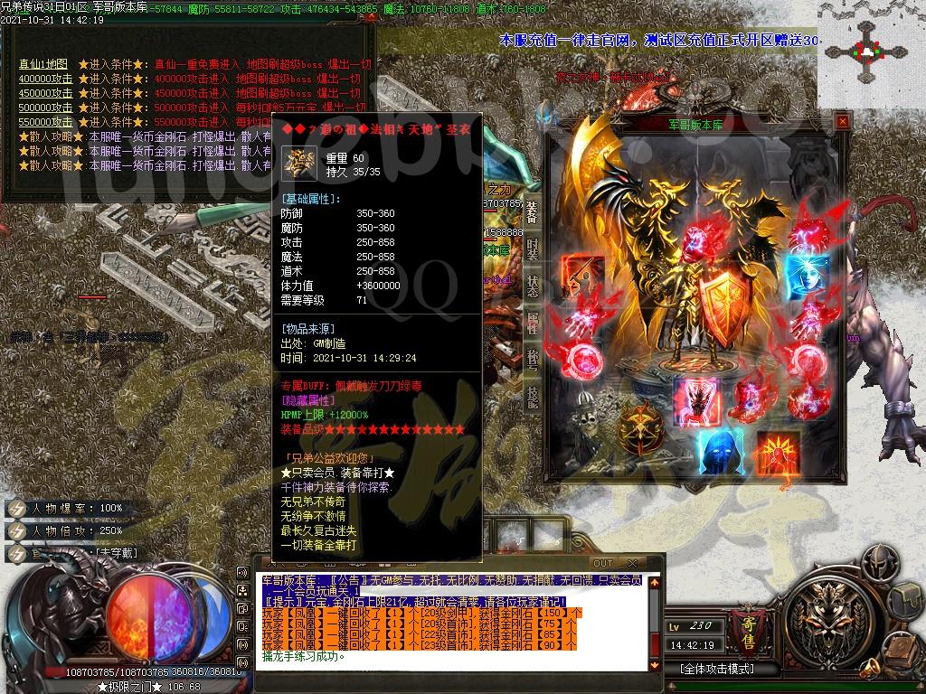 《注意》5 皇宫天降财富说明新区攻城当天晚上21:00-22:00,皇宫每十分钟撒落100充值和一个至尊特殊礼包。