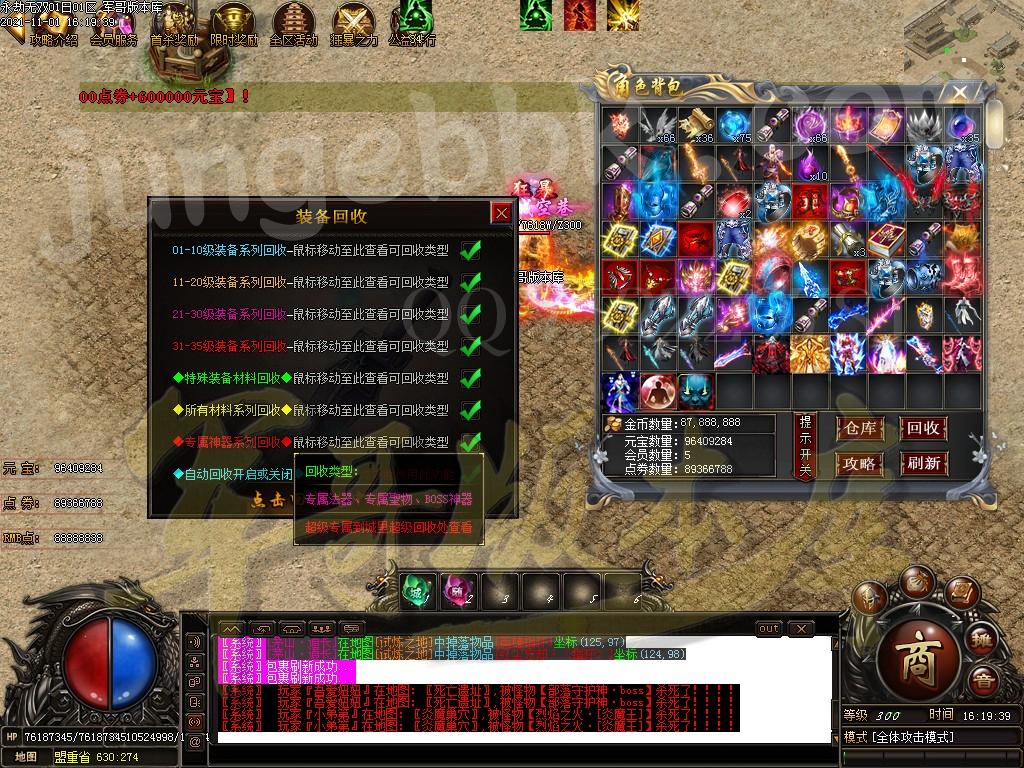 上线直接充值100元触发自动回收 自动捡取功能 ,,土城上面,让宝宝去打大怪,自己打小怪,主要是升级和升勋章才会让号起的快!
