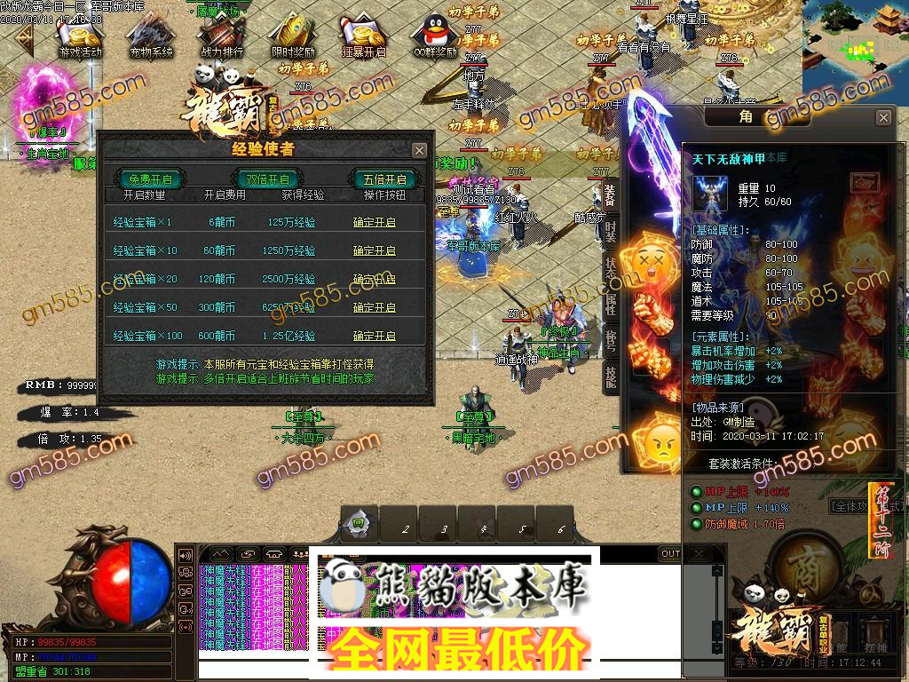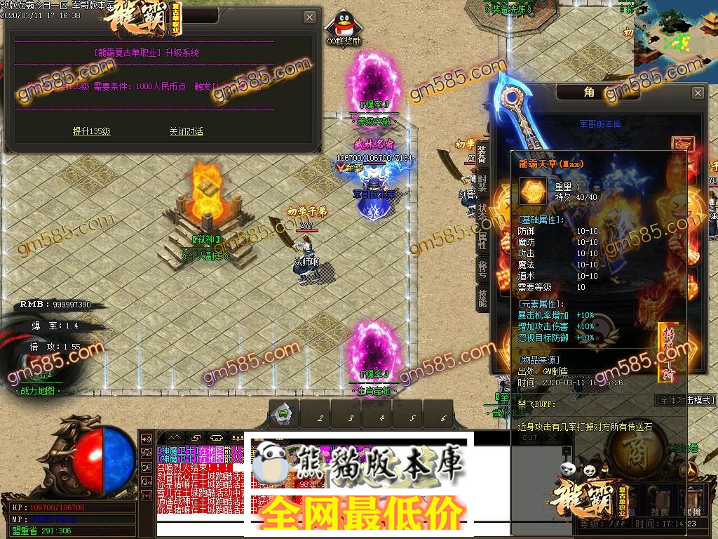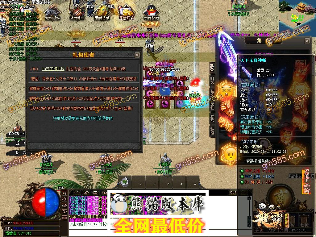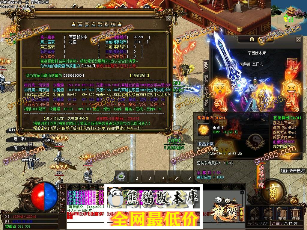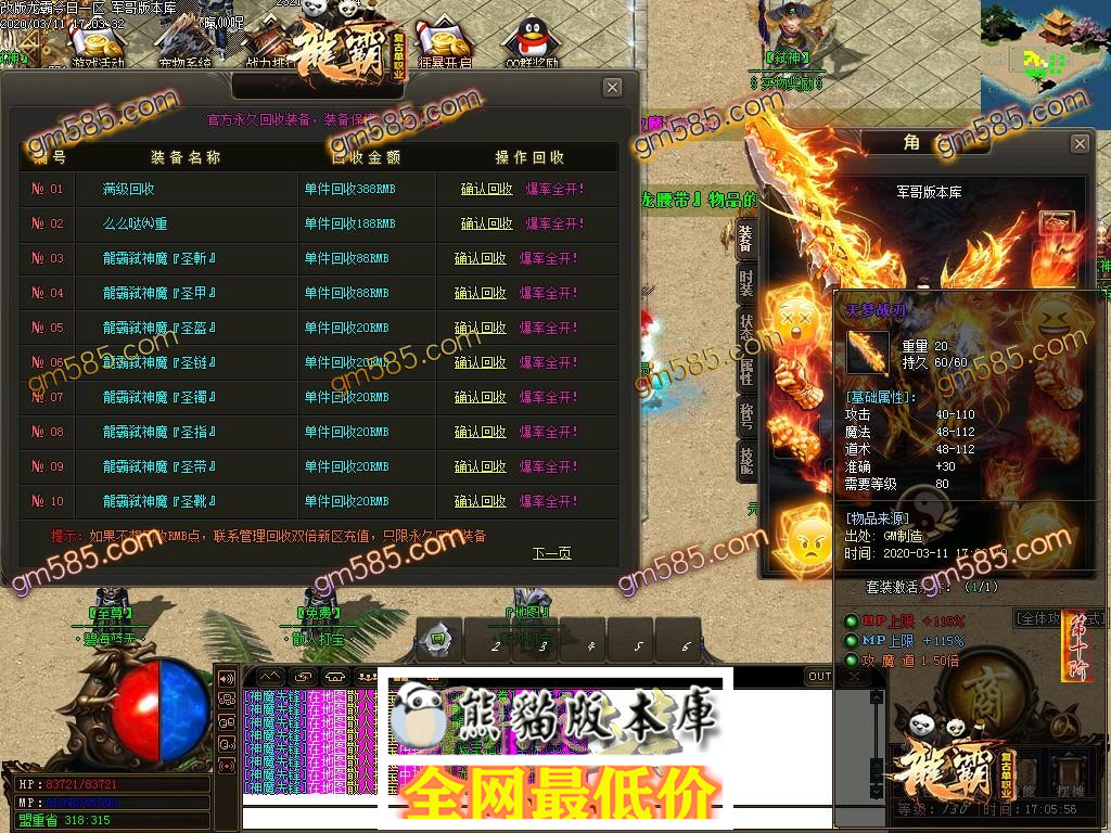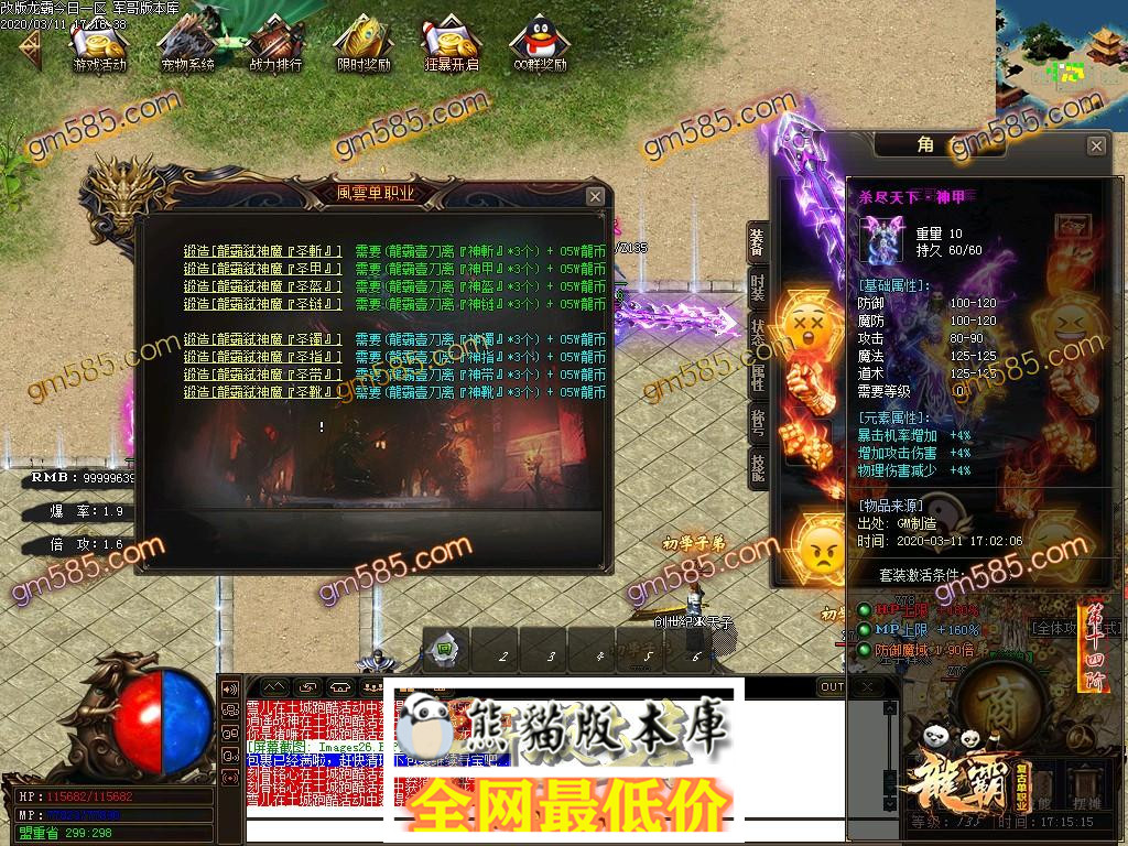 【元宝比例】:本服龍币比例1:500,均可回收,另有多充多送优惠活动哦! 【攻沙设置】:新区开放第2天合区,晚上20点整准时攻沙,奖励丰厚! 【攻沙玩法】:去除以往枯燥无味的城主奖励,独创新鲜刺激的沙城福利系统,越往后面攻沙奖励越丰厚~ 【帐号】:帐号请及时设置二级密码,请勿将帐号轻易告诉他人,不要使用过于简单的账号密码.例如1234.1111111.aaaaaaa.abababab等! 【封杀外挂】:请勿乱下载或者使用加速外挂等,软件很多包含木马,如果发现开启非法外挂或者脱机者不管你是否花钱一律封号处理,绝不手软! 【盾牌系统】:外观帅气,把妹必备,本服决胜关键,玩家杀人杀怪必须追求的东西,能打能抗,每个阶段会获得不同的外观。 【宝物系统】:每个宝物都有不同的属性,装备属性平衡,适合各种玩家,友情提示:均衡发展! 【限时奖励】:本服为回馈玩家,击杀BOSS奖励限时回收奖励,永久回收奖励,轻轻松松赚取高额回报! ============================================================