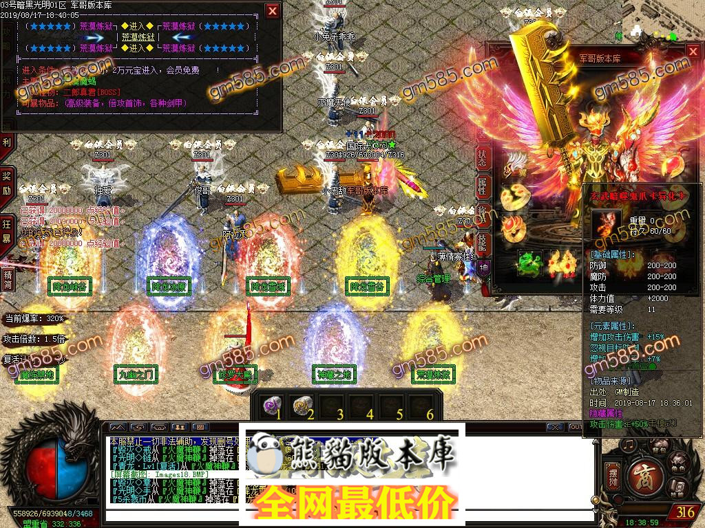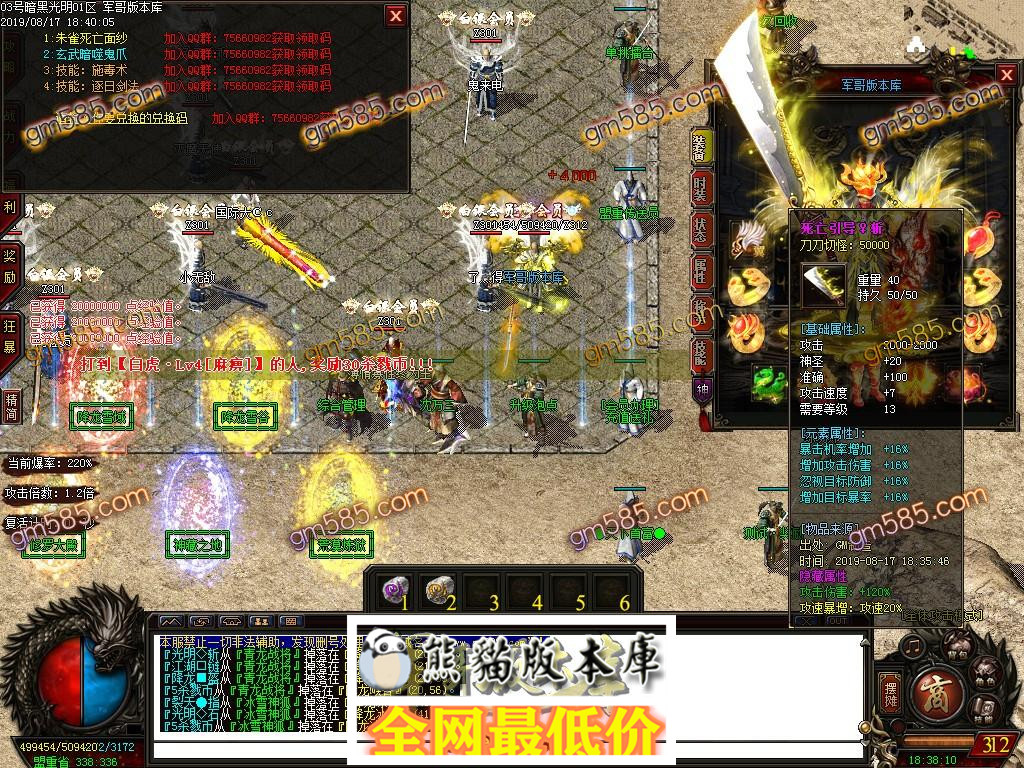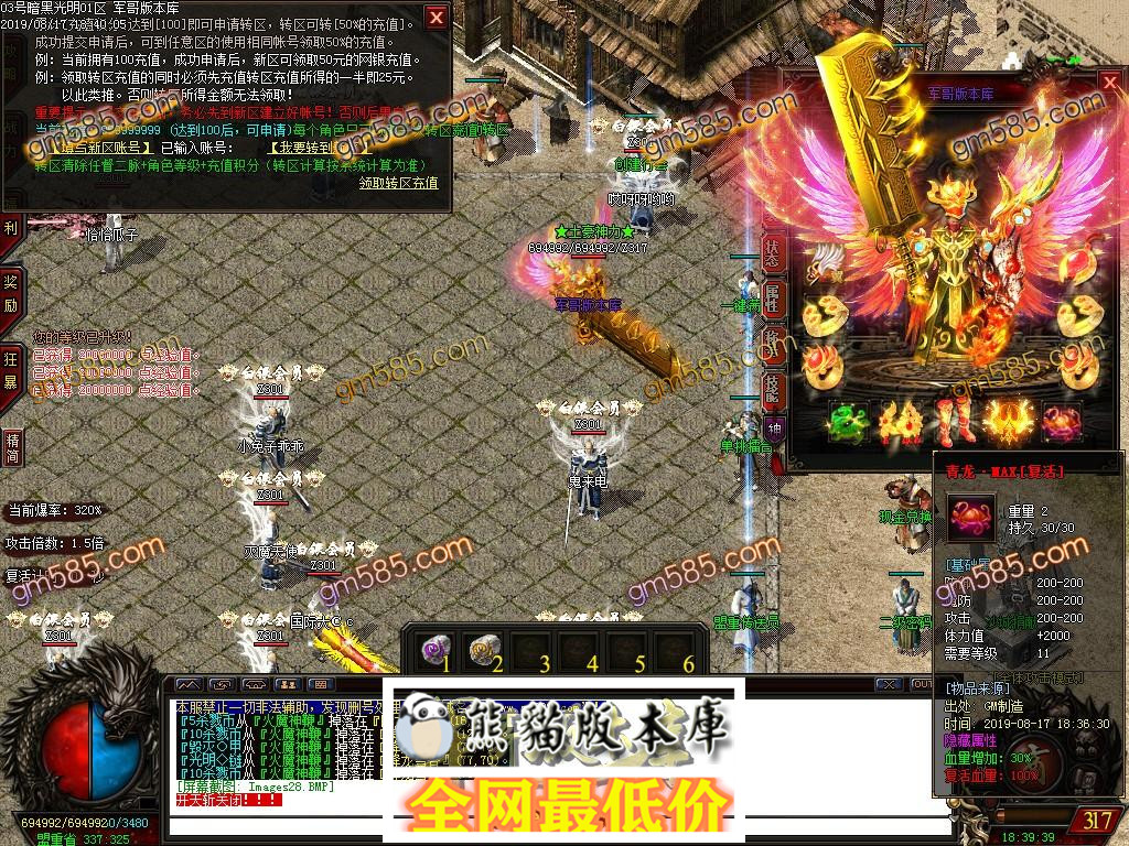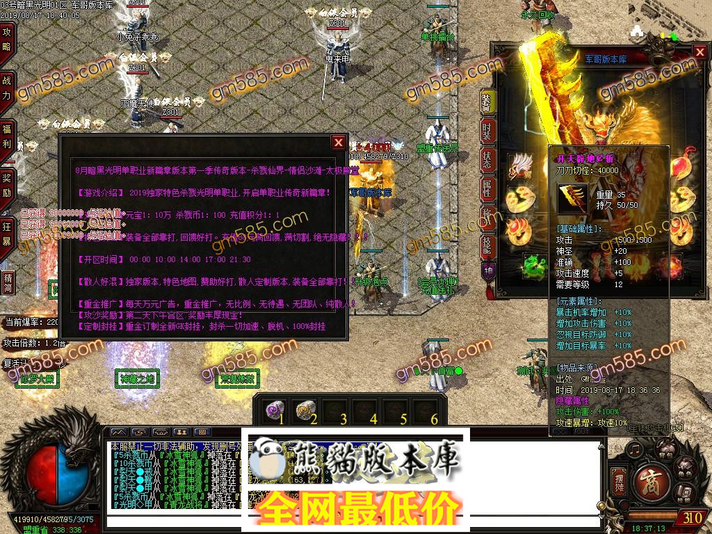 【游戏介绍】2019独家特色杀戮光明单职业,开启单职业传奇新篇章! 【充值比例】测试期间打到装备回收的元宝,元宝开区领取80%,还有空投大礼包!元宝1:10万 杀戮币1:100 充值积分1:1 【攻城奖励】新区二天后合区,晚上8点准时攻城!新区攻城奖励666+红包! 【开区时间】每天稳定开放五个区!一区9:00-二区12:00-三区15:00-四区19:00-五区22:00! 【开区时间】每天稳定开放五个区!一区9:00-二区12:00-三区15:00-四区19:00-五区22:00! 【游戏介绍】上线领取Q群礼包,赠送全套高级技能+刀刀切割称号,祝你打宝起飞! 【游戏介绍】上线领取Q群礼包,赠送全套高级技能+刀刀切割称号,祝你打宝起飞! 【游戏介绍】超多隐藏元素隐藏地图,全新特效装备 重金定制全新装备好看不花哨 【游戏介绍】担保交易请找群管理,被骗后果自负!担保交易请找群管理,被骗后果自负! 【游戏介绍】定制封挂插件 完美封杀一切外挂!定制封挂插件 完美封杀一切外挂! 【进群规则】超多隐藏元素隐藏地图,全新特效装备 重金定制全新装备好看不花!