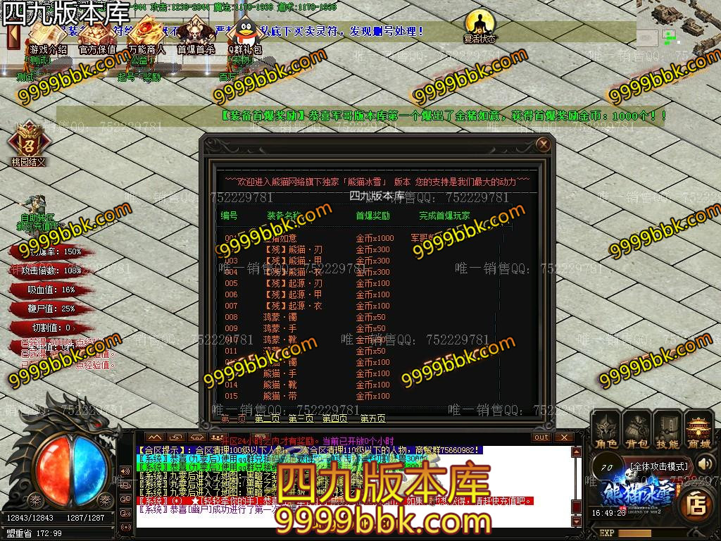 [公告] 充值比例1: 1熊猫币,1熊猫币换10金币,1: 10金币。满10元即可! ! ! [公告]全新独家攻速熊猫冰雪版本来袭 独家创新玩法新颖诚邀兄弟们来战! ! ! [公告]花10分钟进游戏体验一下, 怪物攻城乐趣,夺宝乐趣,大量实物! ! ! [公告]真正的公平公正良心大服打破一切常规玩出你要的个性 ! ! [公告]最好玩装备-切靠打还传奇界最后-片净土! ! [公告]挑战所有冰雪版本不一样的玩法不一样的感觉召唤曾经的兄弟一起激情! ! (公告]具体请玩家上服体验、独家版本、独家玩法、值得体验、错过后悔十年! (本服长期稳定更新) [防骗须知]不要向他人提供你的账户、密码、二级密码、充值信息等信息、小心被骗! [郑重声明]本服绝对是良心大服、玩家新颖、创意无限、持续更新! 本服没有特殊合成,装备全靠打,小怪爆一切 一档 终极礼包16元+沙城捐献30元+狂暴之力10元+半月弯刀10元=66元 二挡 终极礼包16元+沙城捐献30元+狂暴之力10元+时装88元+义结金兰15元+半月弯刀10元=169元 三挡 鸿蒙礼包160元+沙城捐献30元+狂暴之力10元+终极时装176元+义结金兰15元+半月弯刀10元=401元 四挡 鸿蒙礼包*2+熊猫石*4+沙城捐献30元+狂暴10元+终极时装176元+义结金兰15元+半月弯刀10元=761元 五挡 鸿蒙礼包*2+熊猫石*4=+沙城捐献30元+狂暴10元+终极时装176元+义结金兰15元+大魔神1000元+半月弯刀10元=1761元 六:更多细节请咨询QQ群管理或QQ群文件查看。 ============================================================