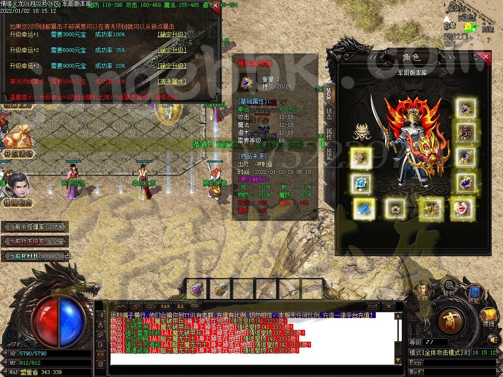 情缘火龙欢迎您!! 【公告】:本服为独家1.80复古版本,版本绝对市面独家,并有加密防盗措施!仅此一家的好服,错过可惜啊。本服除回收客服QQ外,无任何客服QQ,谨防上当受骗! 【公告】:本服封杀所有非法外挂,封挂效果绝对给力!一旦遇到开挂者直接封杀,请玩家珍惜自己游戏中劳动果实,诚信游戏。本服除回收客服QQ外,无任何客服QQ,谨防上当受骗! 【公告】:请大家尽量避免在游戏中[私聊]告诉他人包括您的朋友您的帐号信息,因为游戏中经常有骗子起类似相同姓名进行诈骗!本服除回收客服QQ外,无任何客服QQ,谨防上当受骗! 【公告】:本服专业传奇团队,版本长期更新,如果有好的意见和建议,或发现BUG等可以去留言平台反映!有奖征集,本服除回收客服QQ外,无任何客服QQ,谨防上当受骗! 【公告】:道士不再残废,45级召唤7级白虎,48级召唤2只白虎,52级召唤2只白虎王。道士不再沉默!!! 【公告】:本服长期开放,1.2W血量以上BOSS可以爆出本服所有装备,这不是一天闪服,装备等级需各位努力,本服配有自动封挂系统,请大家共同营造一个良好的游戏环境,请勿使用非法程序,一经发现,零容忍。祝大家游戏开心。 【公告】:为提高人物属性方便玩家打宝,特设置各种NPC,龙的传人,转生服务,爵位捐献,天下第一,武林盟主等。 【公告】:自主练级需手动刷怪,镖车每天五次,龙门镖局活动每天5次,回收系统经验都不容小觑。 【公告】:本服所有装备都可以爆出,付出时间终极装备不再是梦想,。 【公告】:打到其他职业的装备可以进入交易市场摆摊销售。人物下线摆摊也不会消失。 【公告】:财富广场是获得元宝的捷径,各位不要错过哦。友情提示:本服除回收客服QQ外,无任何客服QQ,谨防上当受骗! 【公告】:近期发现有盗、骗元宝装备的行为,请收购小号元宝、私下交易的玩家注意元宝来源。系统检测非法元宝无理由清除 ============================================================