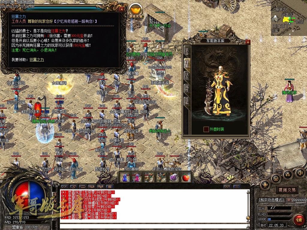 • 增加散人打宝地图,免费进入,每一层都有很多BOSS!最后一层为蝴蝶谷!很凶险!