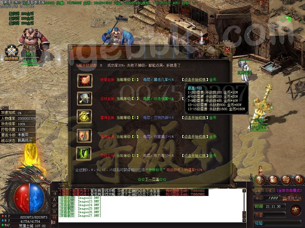 狂暴: 提示1.【元神觉醒】林态下:打怪伤害+20第 提示2.【元神觉醒】状态下:人物爆率+25好 提示3.【元神觉醒】状态下:攻击伤害5% 提示4.【元神觉醒】状态下:领悟:半月弯刀 提示5.【元神觉醒】状态下:●死我有惊喜● 提示6.【元神觉醒】状态下:被人物击杀时状态消失,击杀者获得50 被怪物杀死时林态不消失