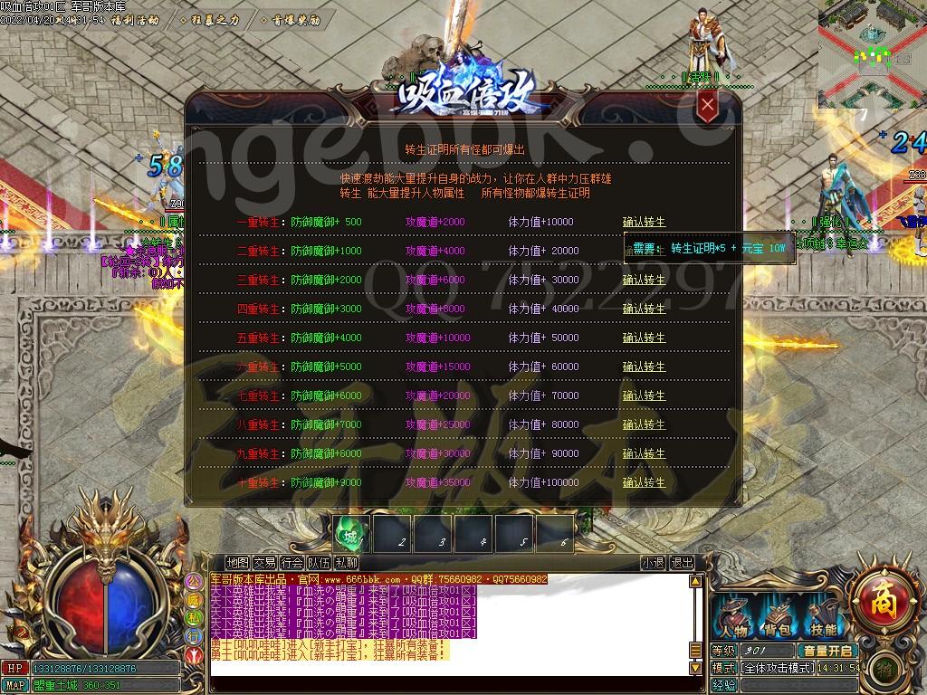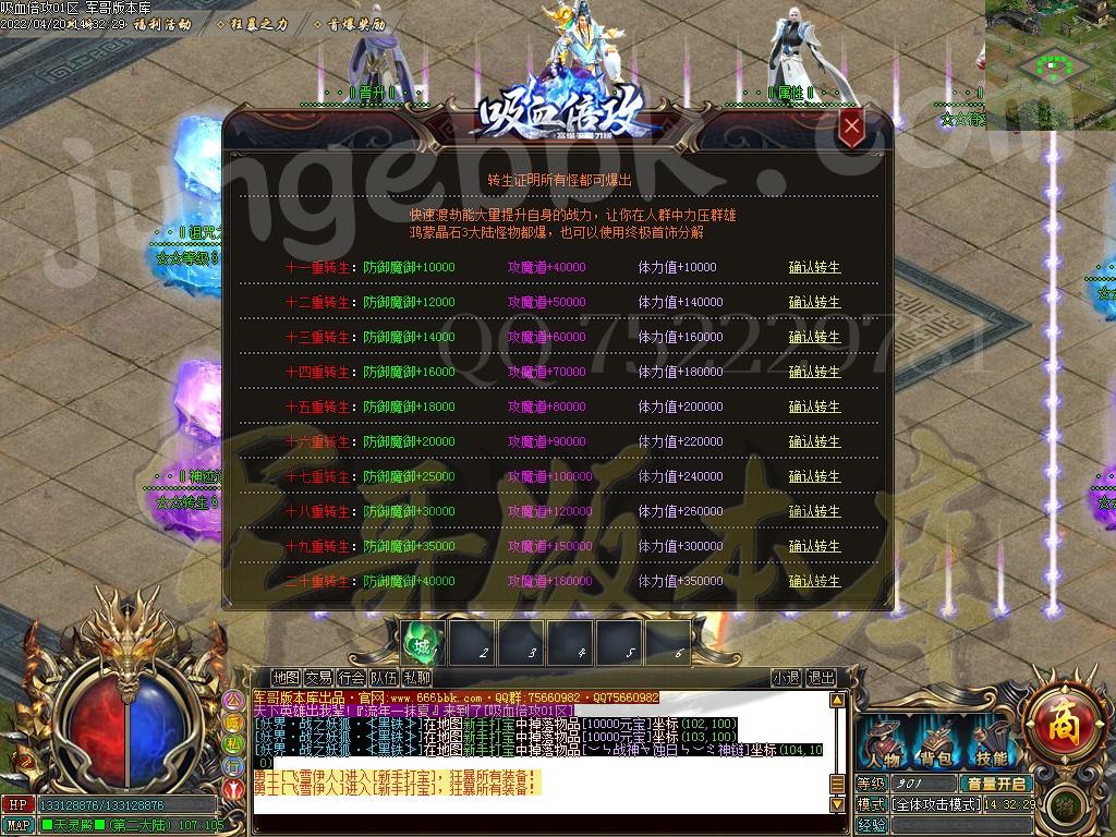 〖转生 介绍〗:共分20转,可以通过元宝晋升,元宝打怪或者回收装备获得