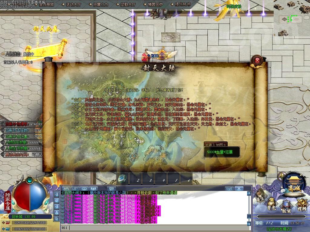 本服一起六个大陆:一大陆【封妖城】 二大陆【云顶】 三大陆【仙罡】 四大陆【封天画卷】 五大陆【超脱】 六大陆为【鸿·蒙】