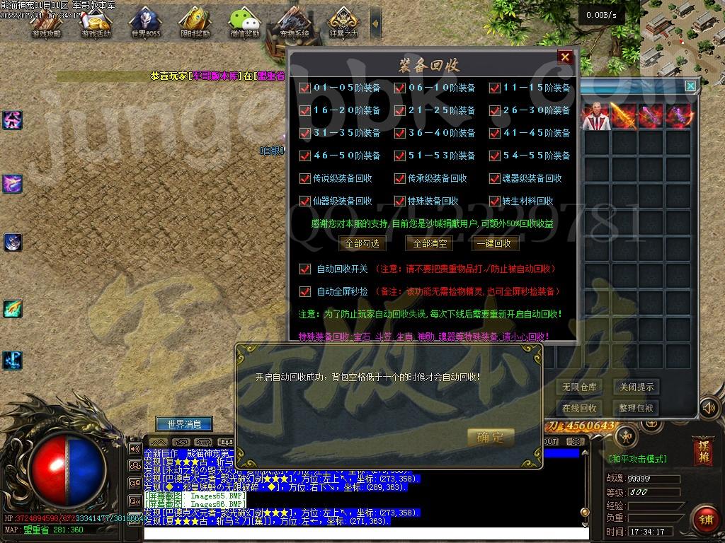 3.回收低中高级装备,会依次得到数里不等的元宝.