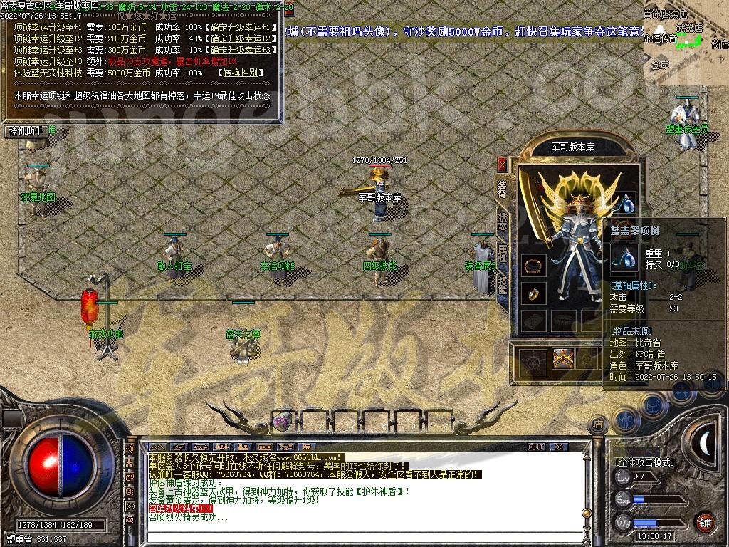 【幸运介绍】:运2项链爆率高,武器幸运最高加7,普通祝福油可以喝到运5,BOSS爆超级祝福油,不花钱也能运9。