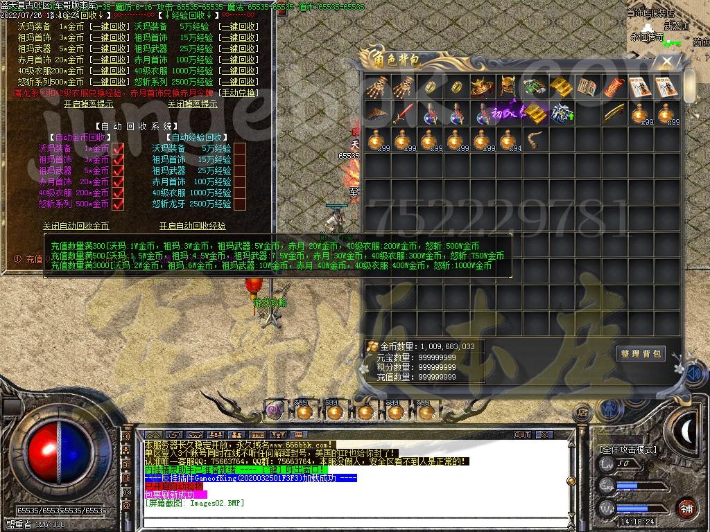 【充值介绍】:金币比例1:30万,测试区充值送30%;充值300元开启自动回收功能,充值500开启1.5倍回收。