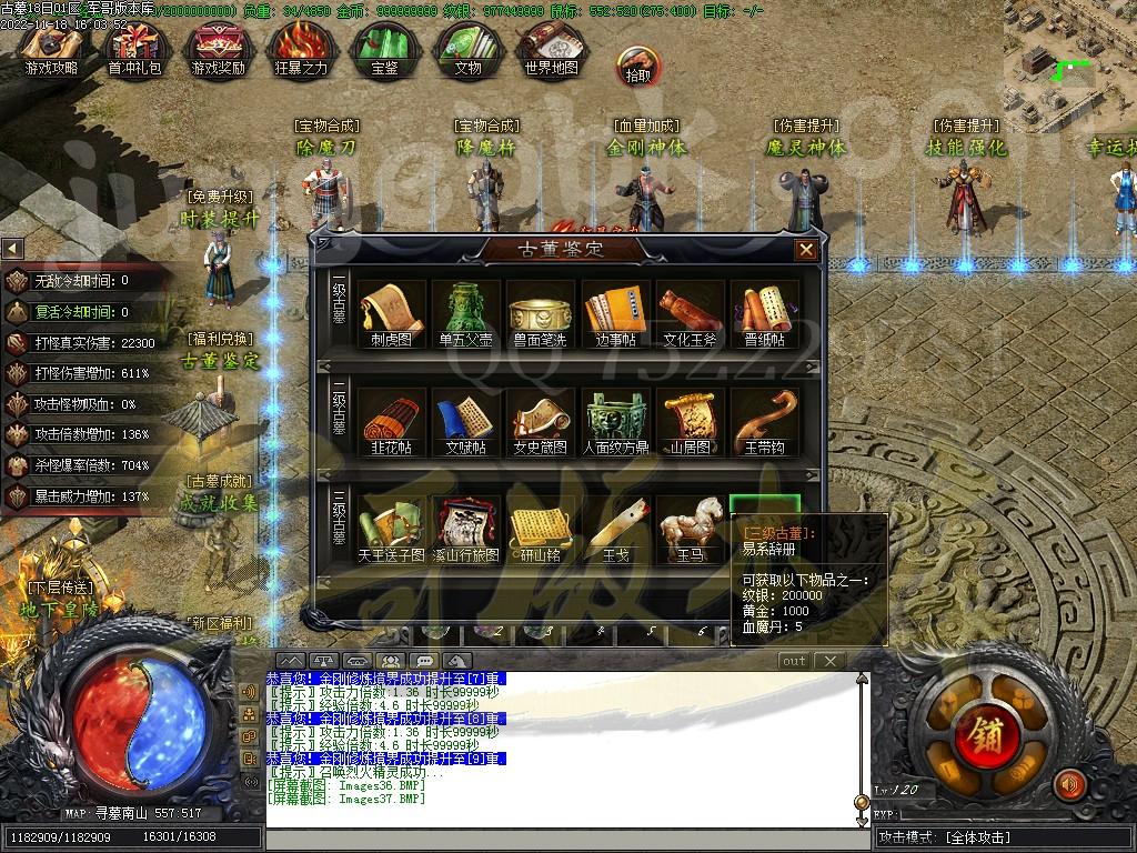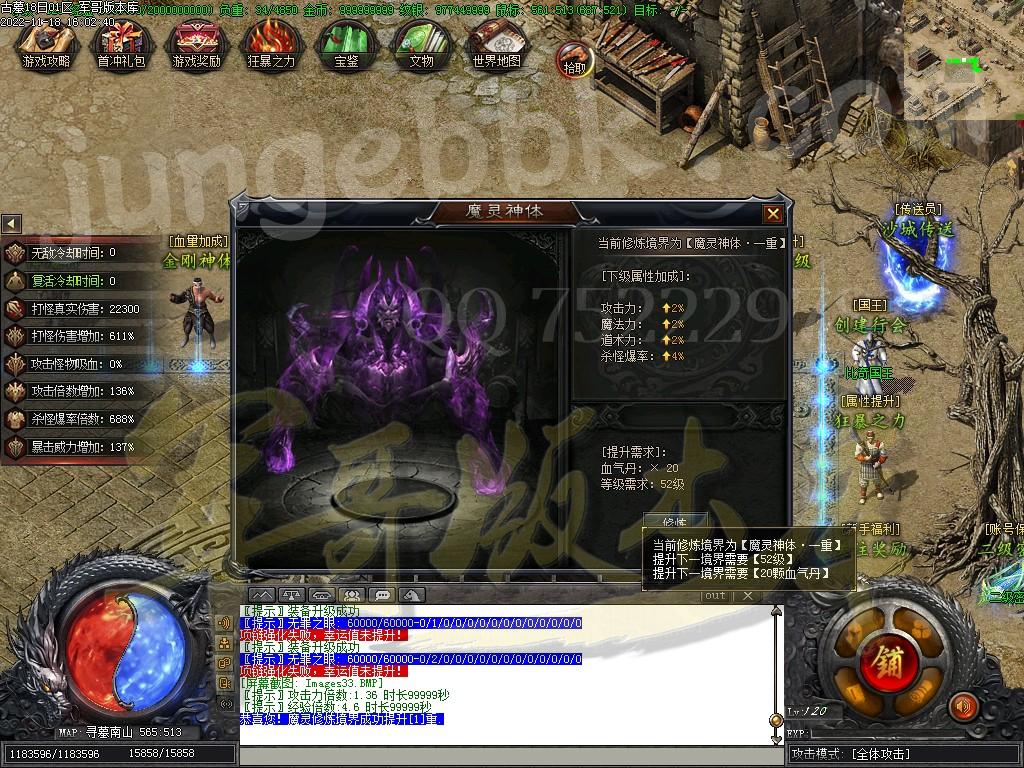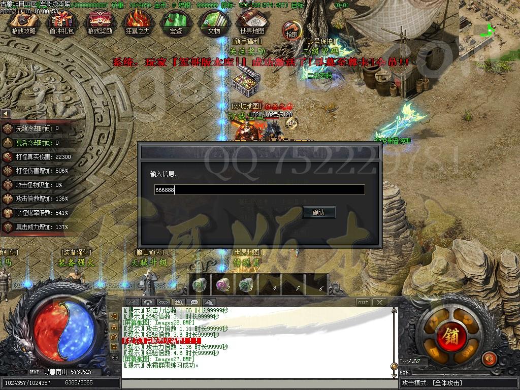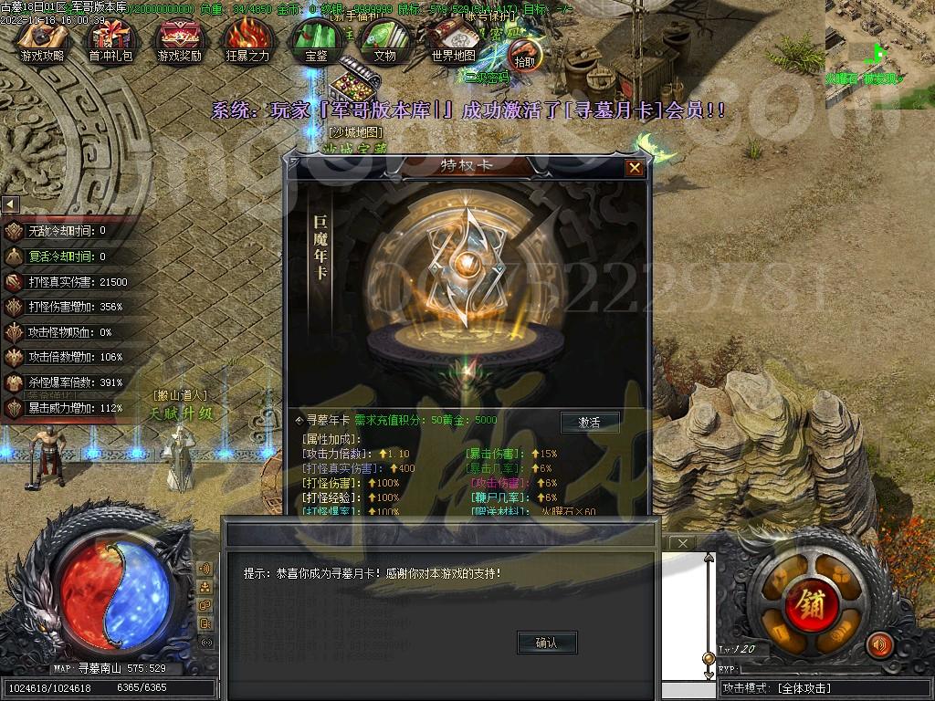 [沙城地图活动说明] 开区第三天[22:00]在地图[沙城宝库]刷新大量 [宝藏守护官] 每一个月卡会员,增加1-6只[宝藏守护官] 每只[宝藏守护官]保底必爆50-300 本区预计产出[20-1800] [进入条件]: 激活任意会员的沙巴克成员免费进入