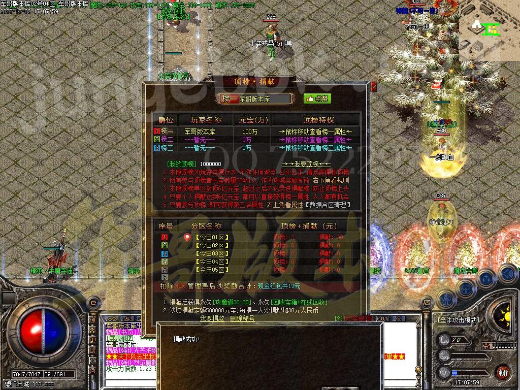 2000米玩家:一个沙捐+一个2.0腰牌+终极时装+终极称号 剩余元宝各种收经验、金刚石、装备 开启遇神杀神无敌模式