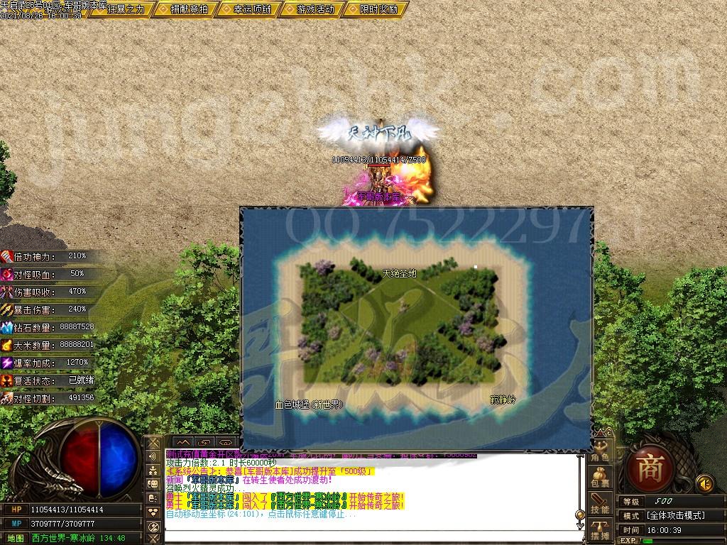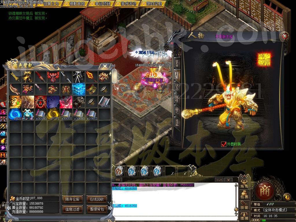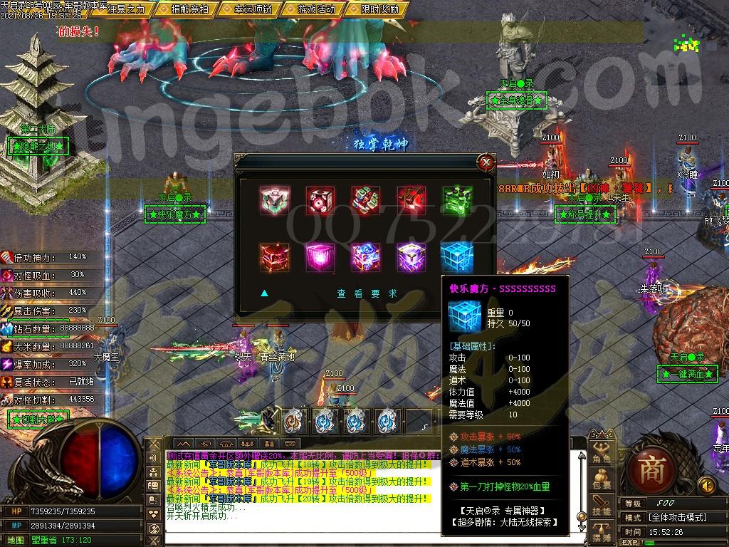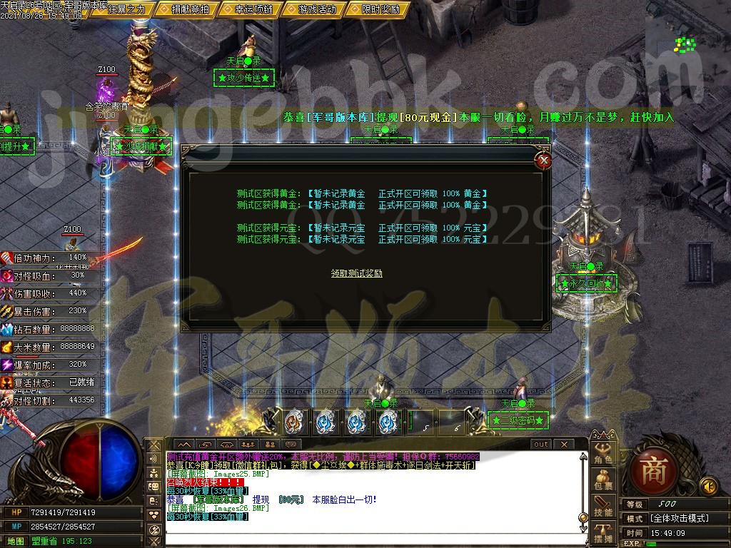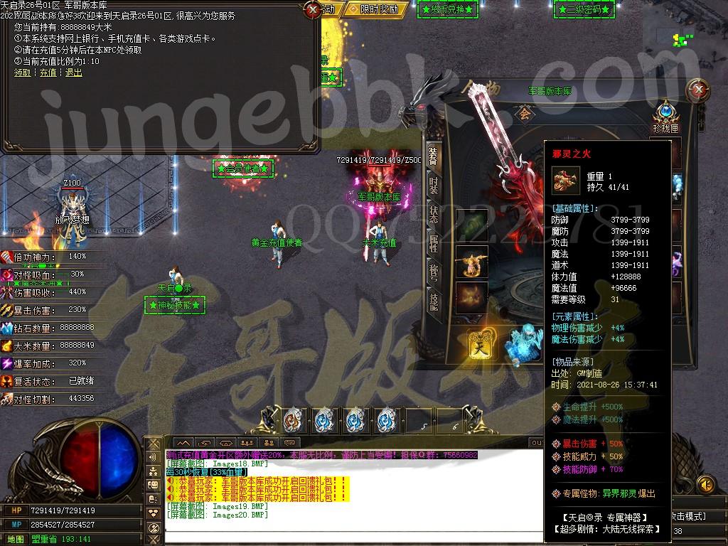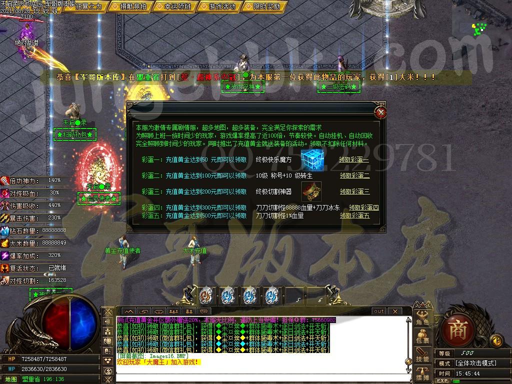 另外444级怪开始都有几率出所有神器,技能,时装衣服,神器剑甲等等 花钱只是起步快,所有怪物必爆黄金,称号卷轴爆率也是极高,
