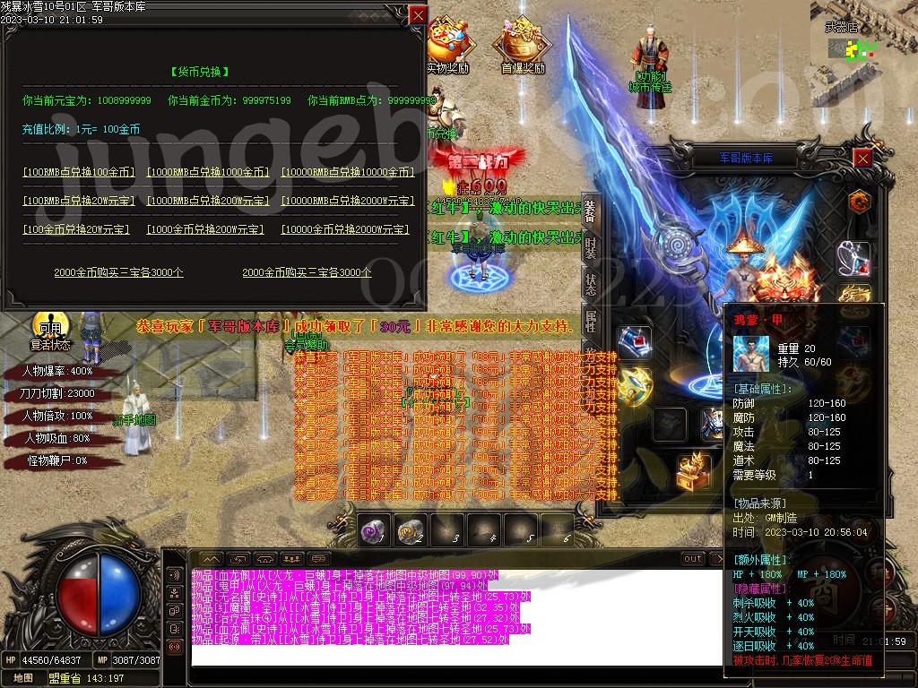 充值比例1米=100金币  打到实物兑换成金币一样可以进行本服所有消费.