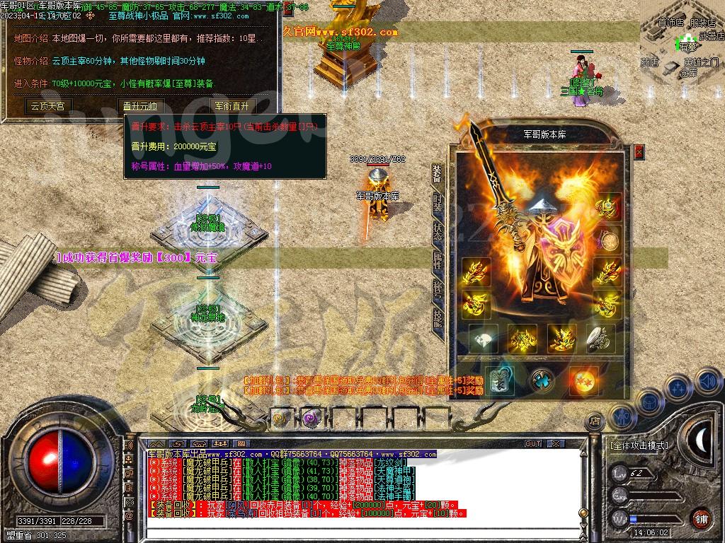 【装备介绍】:本服装备珍贵,且爆率真实,魔龙教主爆一切,开天凤天系列均可在游戏中爆出,+3以上的尤其珍贵,永久官网www.sf302.com
