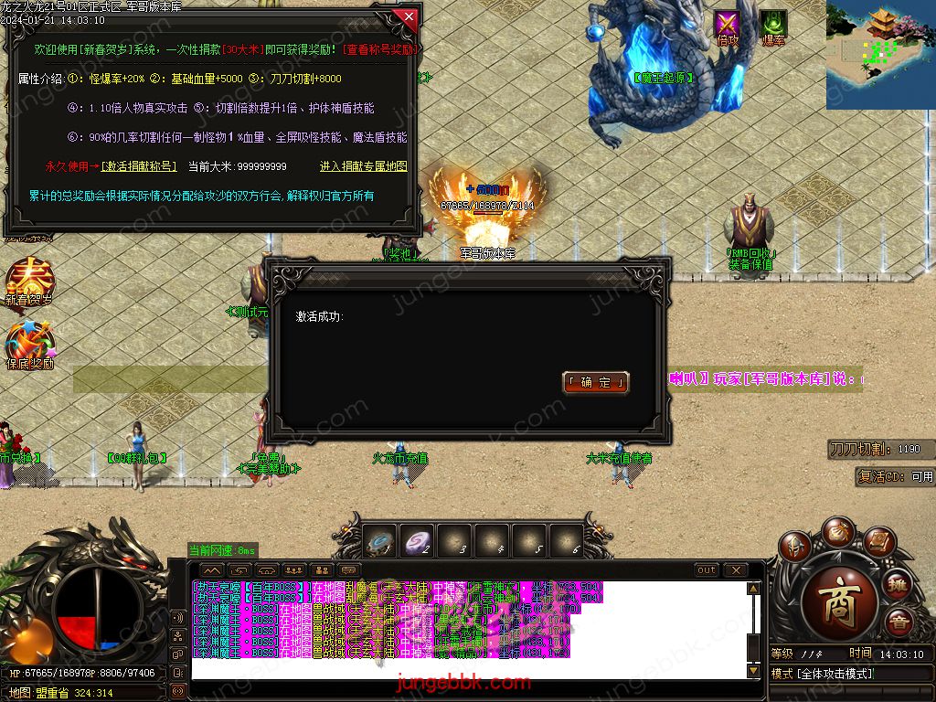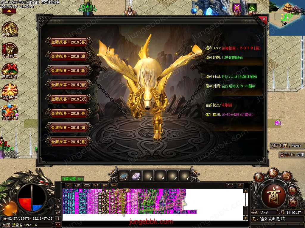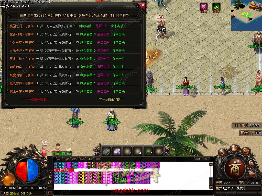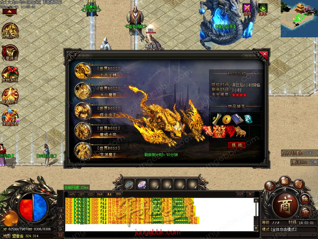 【玩法介绍】:本服新区都会有大量保底BOSS,实物等奖励,奖励丰厚,必出终极!