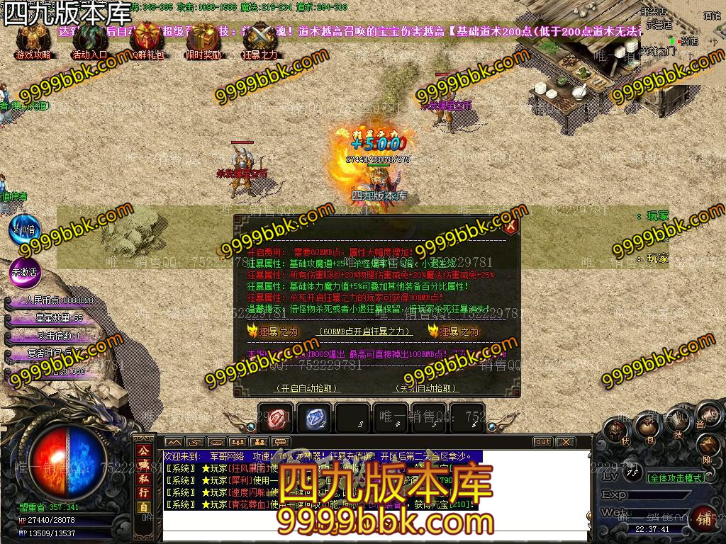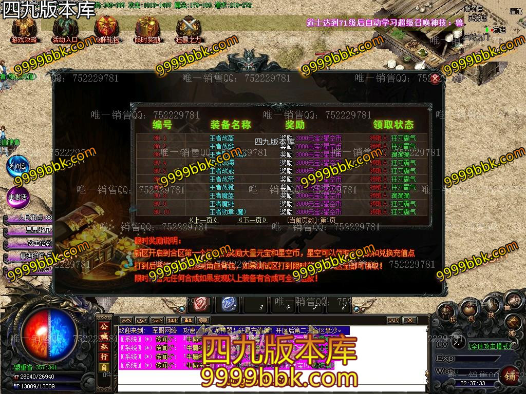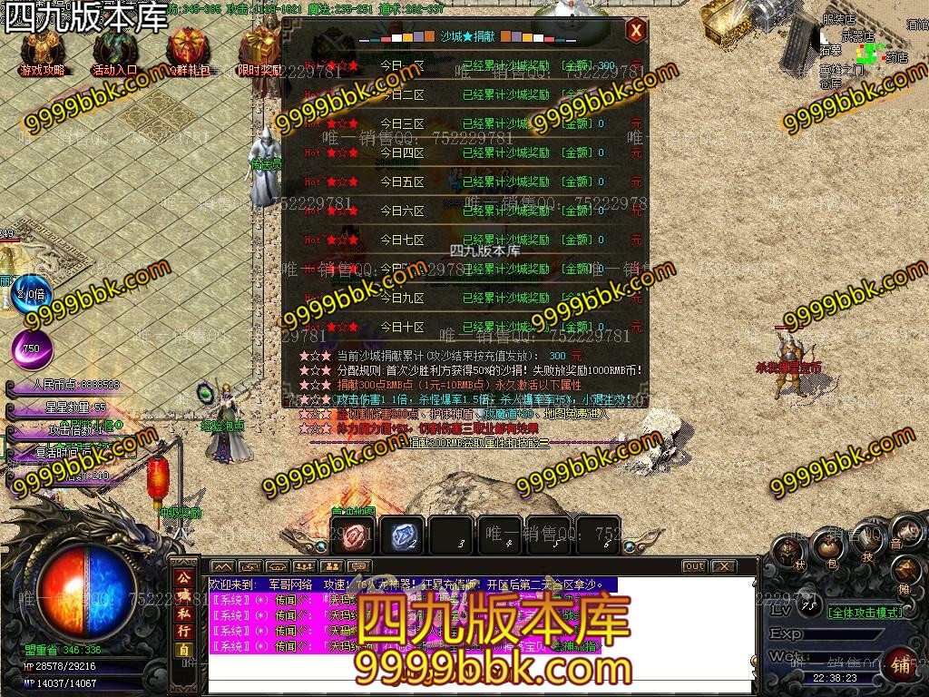 占沙奖励:新区第2天合区,第2天统一攻沙,首次拿沙奖励400万元宝+狂暴捐献70%的收益,首次攻城后22:05刷新一只世界BOSS,必爆大量终极装备!