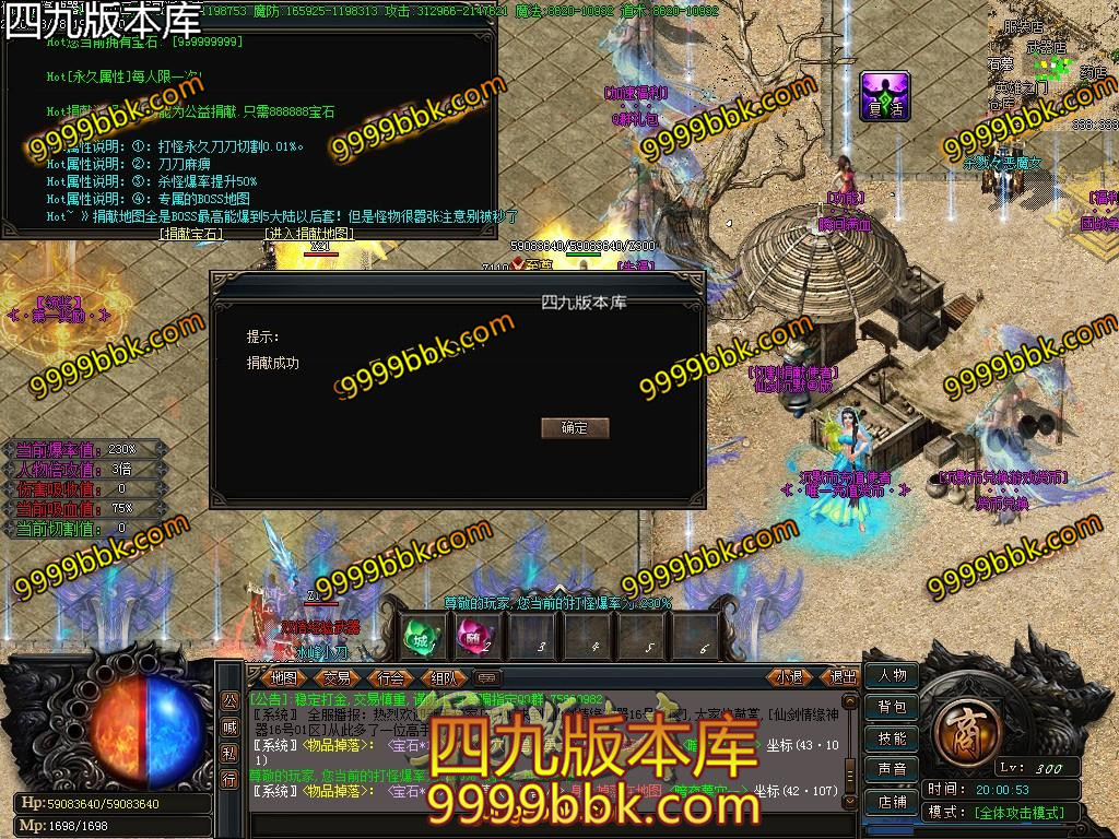 捐献使者:50%杀怪真实爆率、刀刀麻痹、刀刀切割Lv200以下的怪物1%最大血量、专属打宝地图(刷新全服顶级BOSS)