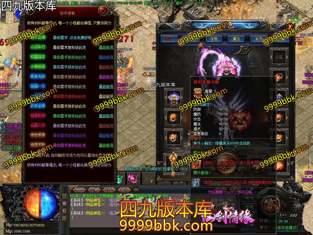 游戏称号:炫酷的称号外形,人物属性暴涨,人物爆率大幅增加、元素属性暴增,增加爆率唯一途径。
