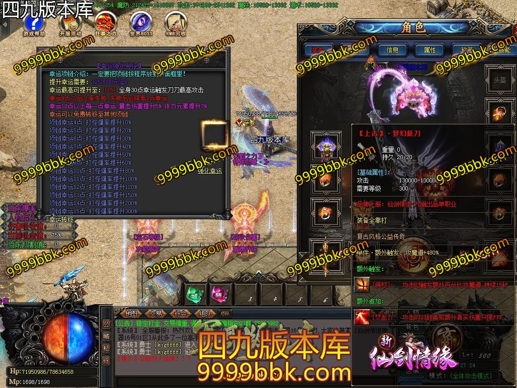 ⑨幸运项链:所有项链均可增加幸运,只需要元宝,最高+15幸运项链可获得300%的杀怪爆率。